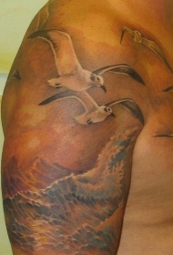 肩部美丽的海鸥在海面上飞翔纹身图案