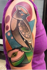 手臂原始风格彩绘小鸟与苹果纹身图案