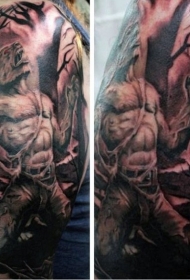 大臂点刺风格黑色士兵头盔和乌鸦纹身图案
