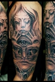 大臂黑灰恶魔般的女人肖像骷髅纹身图案