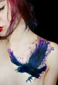 女生肩部梦幻般的水彩乌鸦纹身图案