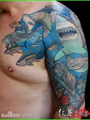 肌肉男肩部鲨鱼的搏斗刺青图案