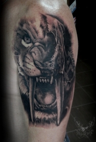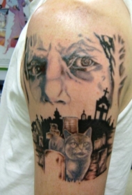 大臂彩色女性肖像结合骷髅与猫纹身图案