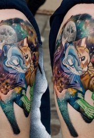手臂彩色怪物夫妇与猫和蝙蝠纹身图案