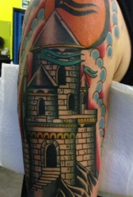 肩部五彩古堡旗帜纹身图案