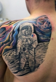 男性肩上彩色的太空人纹身图案