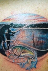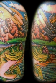 肩部大五彩钓鱼主题纹身图案
