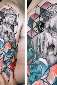 肩部有趣的半彩色如来佛祖雕像纹身图案