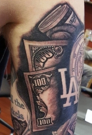 手臂黑棕色美元钞票与时钟纹身图案