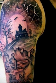 肩部墓地和蝙蝠可怕的神秘教堂纹身图案