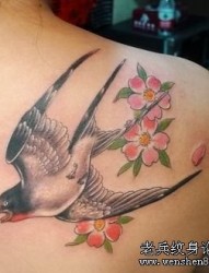 潮流的美女肩部图腾树枝小鸟纹身图片
