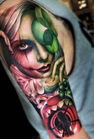 令人难以置信的彩色肩部女人与花纹身图案