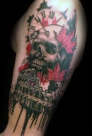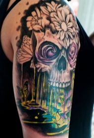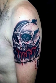 男性肩部彩色血腥头骨纹身图案