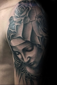 肩部黑灰石雕风格女子鲜花纹身图片