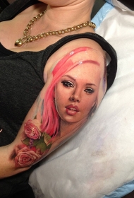 新风格带玫瑰女人的彩色肩部纹身图案