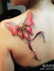 女人肩背一幅精美的彩色蝴蝶结纹身图片