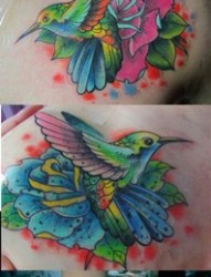 男人肩膀处漂亮的彩色小蜂鸟纹身图片