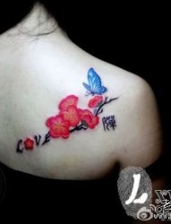 女人肩背漂亮时尚的梅花蝴蝶纹身图片