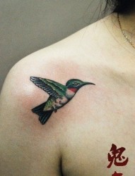 女人肩膀处小巧时尚的蜂鸟纹身图片