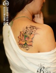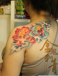 女人肩膀处唯美漂亮的彩色莲花纹身图片