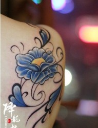 美女肩背精美好看的水墨写意牡丹纹身图片