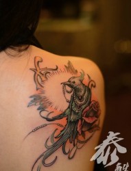 女人肩背漂亮潮流的小鸟与玫瑰纹身图片