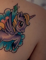 纹身520图库推荐一幅女人肩部彩色独角兽纹身