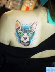 一幅女人肩背彩色猫纹身图片由纹身520图库推荐