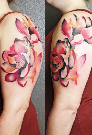女性肩部彩色各种花卉纹身图片