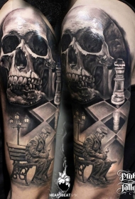 肩部黑灰色水洗人类骷髅与棋手纹身图案
