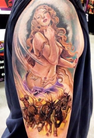 彩色肩部诱人女人与马纹身图案