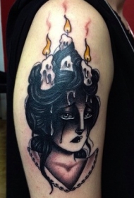 肩部彩色女人头部燃烧的蜡烛纹身图案