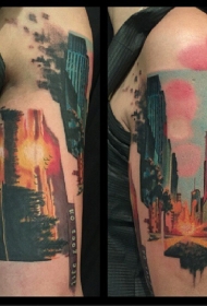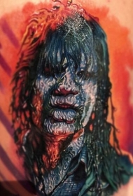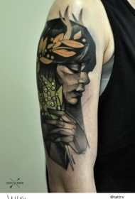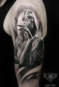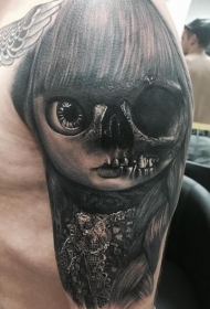 肩部黑灰一半正常的半骨架娃娃纹身图案