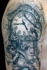 肩部黑灰色洗涤风格时钟与恶魔纹身图案