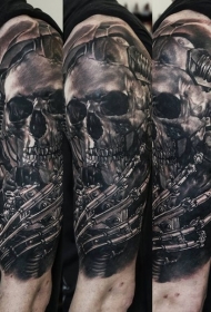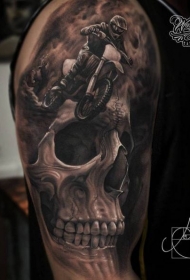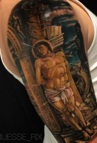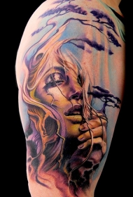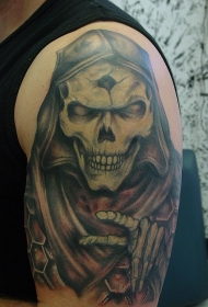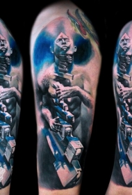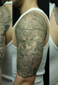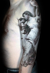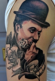 肩部黑棕色雕刻人物与玫瑰纹身图案