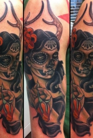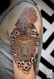 肩部素描风格彩色部落妇女与狼头盔纹身图案