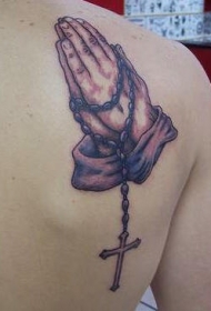 肩部棕色祷告的手与十字架纹身