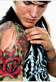 肩部欧美彩色祈祷手与玫瑰纹身图案