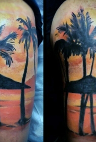 肩部彩色海洋日落与棕榈树纹身图片