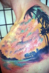肩部彩色海滩和棕榈树纹身图片