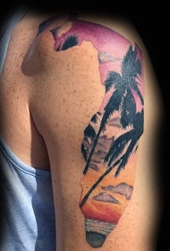 肩部圆形的彩色夜空和棕榈树纹身图案