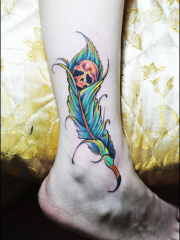 脚踝彩绘羽毛包裹着骷髅头纹身