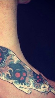 脚背上骷髅花纹的猫咪纹身