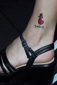 心形花朵和英文字母脚踝纹身图案