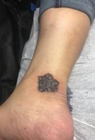 女生脚踝上黑色点刺简单线条植物花朵纹身图片