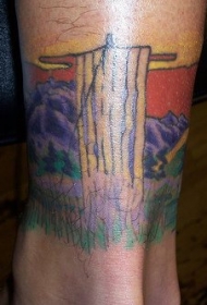 山水瀑布彩色脚踝纹身图案