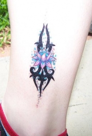 设计彩色莲花和黑色图腾脚踝纹身图案