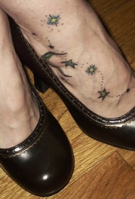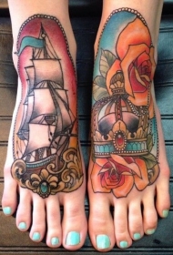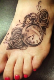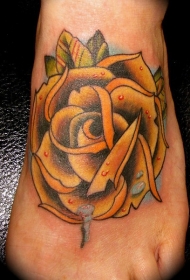 女性脚背彩色黄色玫瑰与露水纹身图片