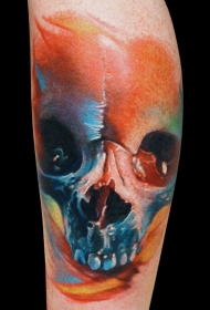 腿部水彩画骷髅头纹身图案