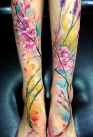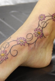 女性脚背彩色细枝卷曲花朵纹身